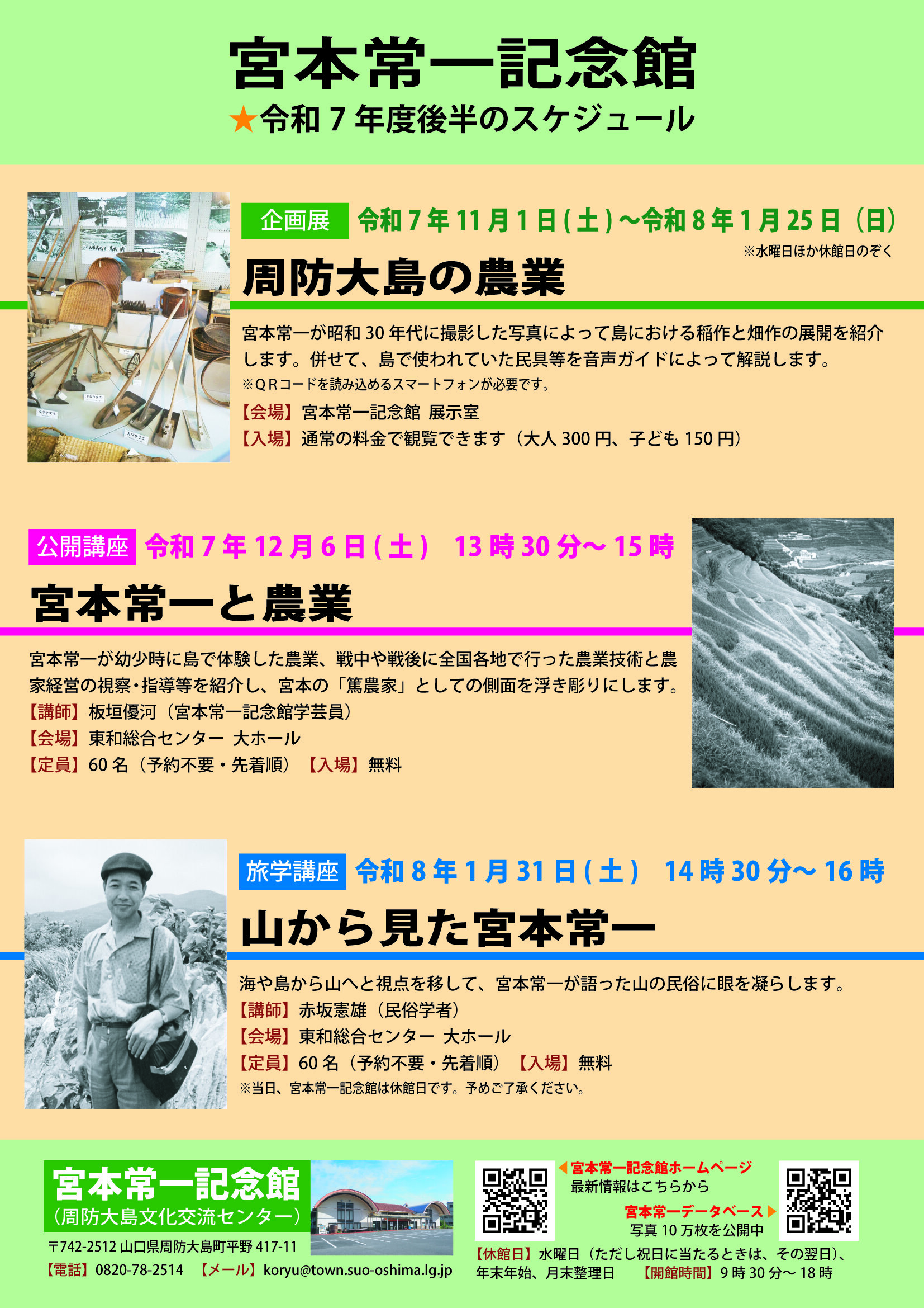 令和7年度 宮本常一旅学講座「山から見た宮本常一」 講座|2026年1月31日 14時30分~16時 会場東和総合センター 大ホール 料金無料 概要 海や島から山へと視点を移して、宮本常一が語った山の民俗に眼を凝らします。詳細は下のチラシをご覧ください。