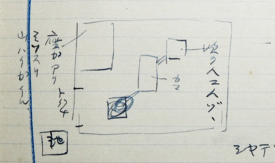 砂鉄精錬は秋から冬にかけて行われた。調査ノートにはタタラバの簡単な平面図も描かれている(写真1)。まず土で構築したカマに砂鉄を入れ、フイゴで送風し、三昼夜吹き続けると砂鉄が熔解する。それを小屋の外にある池へ、溝を伝って流し出す。池の中で砂鉄は急速に冷えて破砕し、小さな塊になる。これが「ズク」という銑鉄である。時にこれが大きな塊になることもあるが、そうなると失敗で、これを「カナイゴサンノキゲンガワルイ」とみなした。