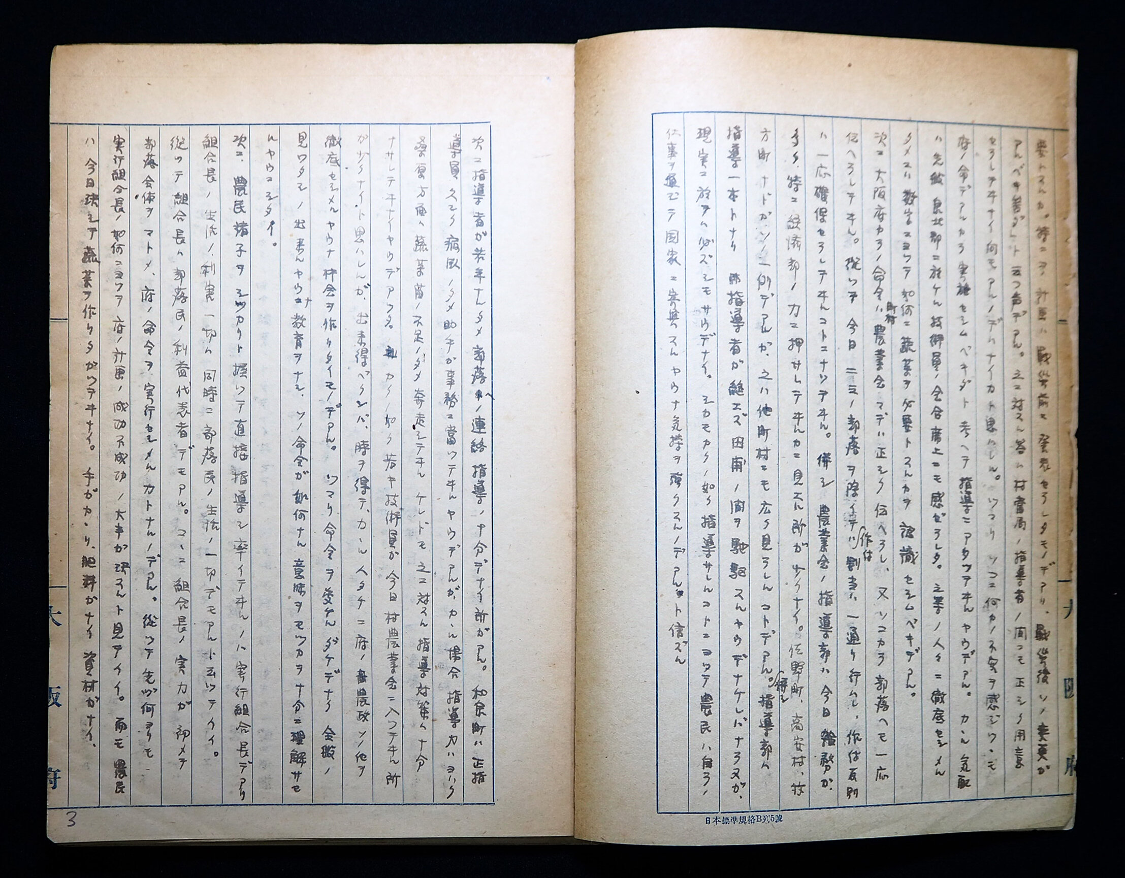 宮本が府下農村を視察した結果は、彼が農務課嘱託として大阪府知事に提出した復命書によって見ることができる。これら文書はすでに『新農村への提言Ⅰ』(宮本常一著作集第46巻)として印刷に付されているが、宮本常一記念館ではB5判の大阪府罫紙に黒ペンで手書きした都合5部、計63枚からなる原文書の束がある(文書3-2/0014/01/00、写真1)。以下、その記述内容を分析し、宮本がどのような視点で農村調査を進めていたのかを検討する。