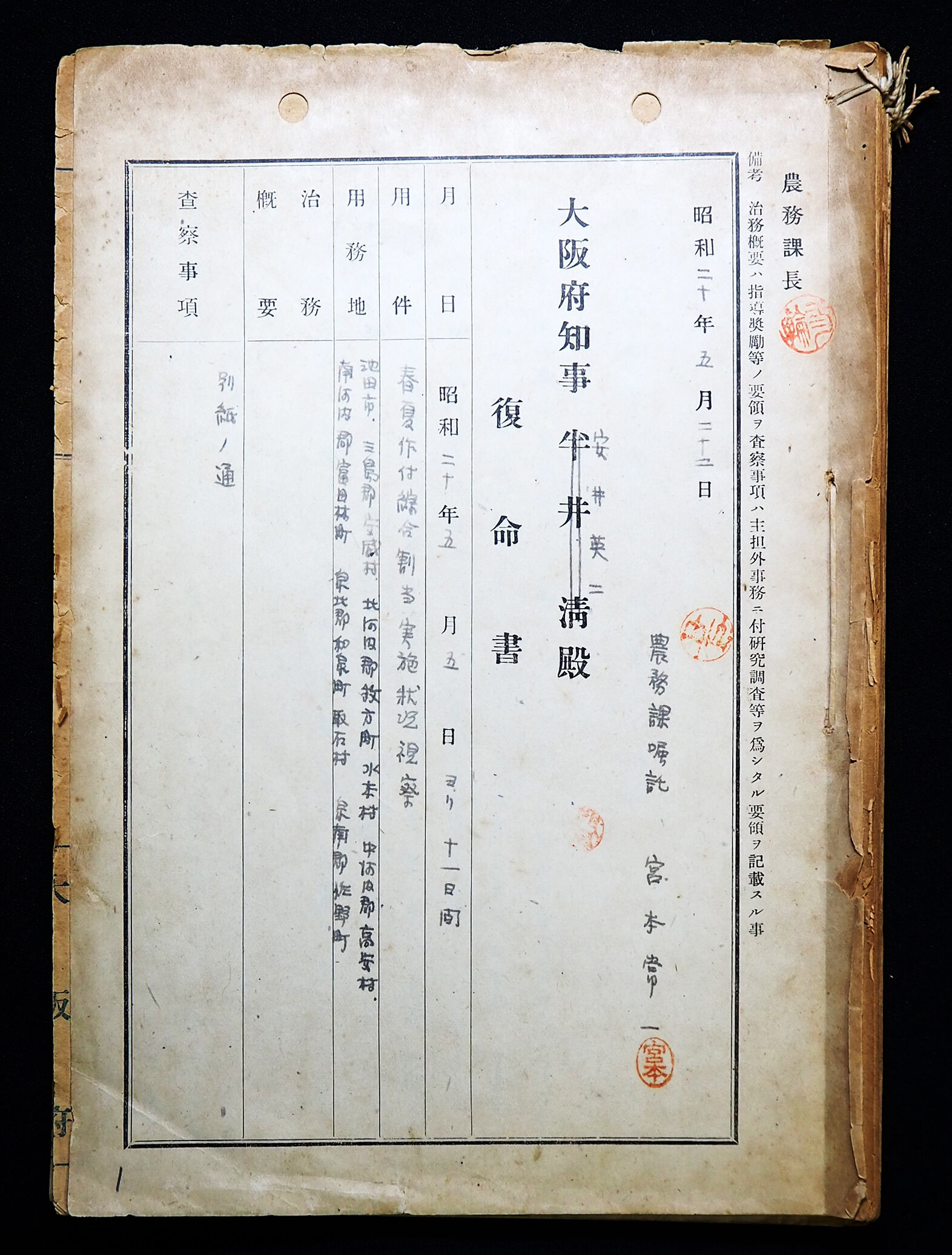 まず1945年5月22日付けで提出した復命書(用件名「春夏作付綜合割当実施状況視察」)には、蔬菜の総合割当実施状況について、5月5日以降府下農村を査察した結果が記されている。宮本は5月18日の日記で「今日は水本へ出かける。四條畷まで電車でゆき、そこから歩く。田甫[圃]の百姓とはなすと仲々色々の事情で府の政策も実行出来ないことがわかる」と書いている(毎日新聞社2005:98)。復命書では、自らが現場で見聞したその「色々の事情」を踏まえた提言がなされている。