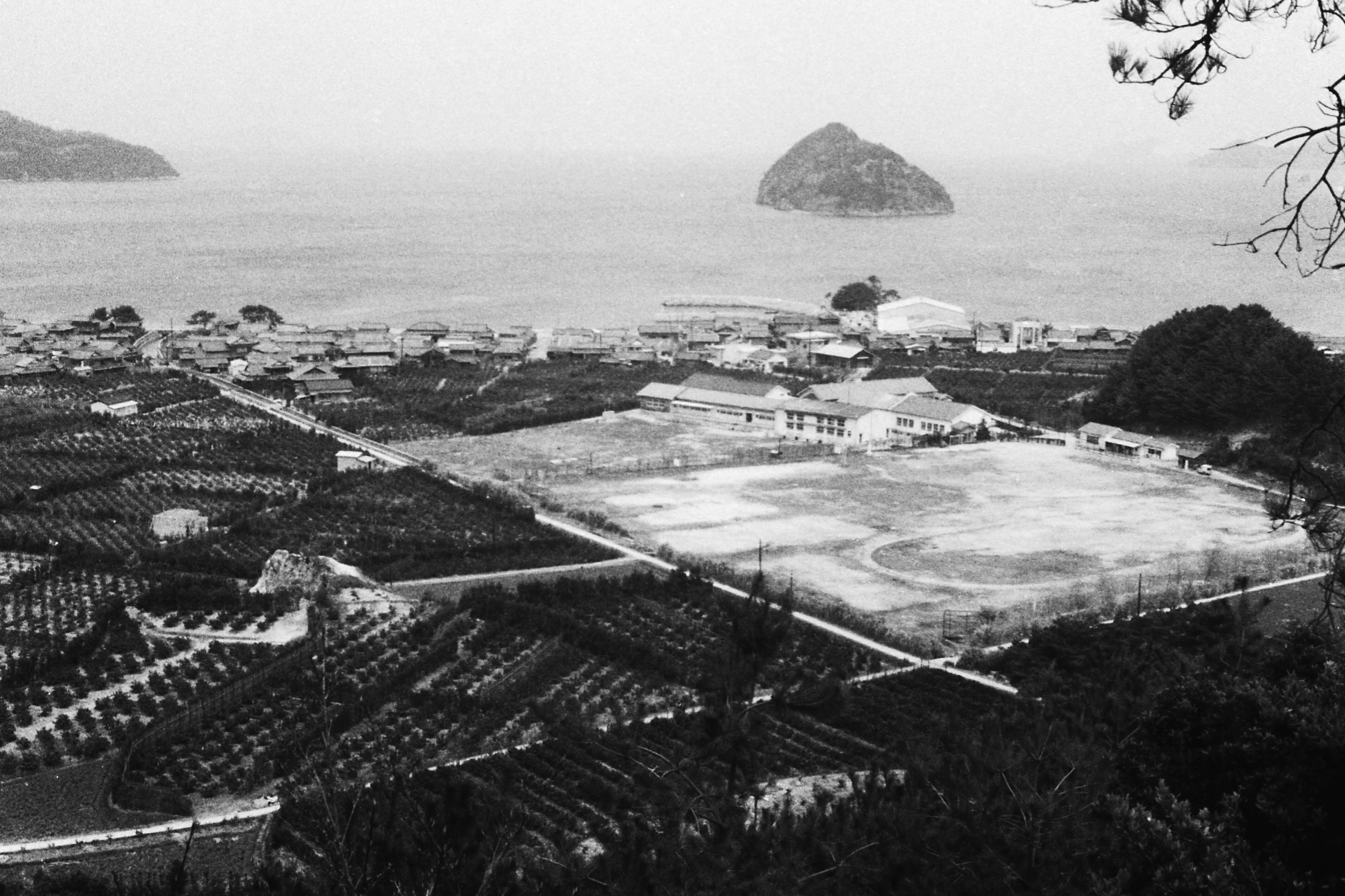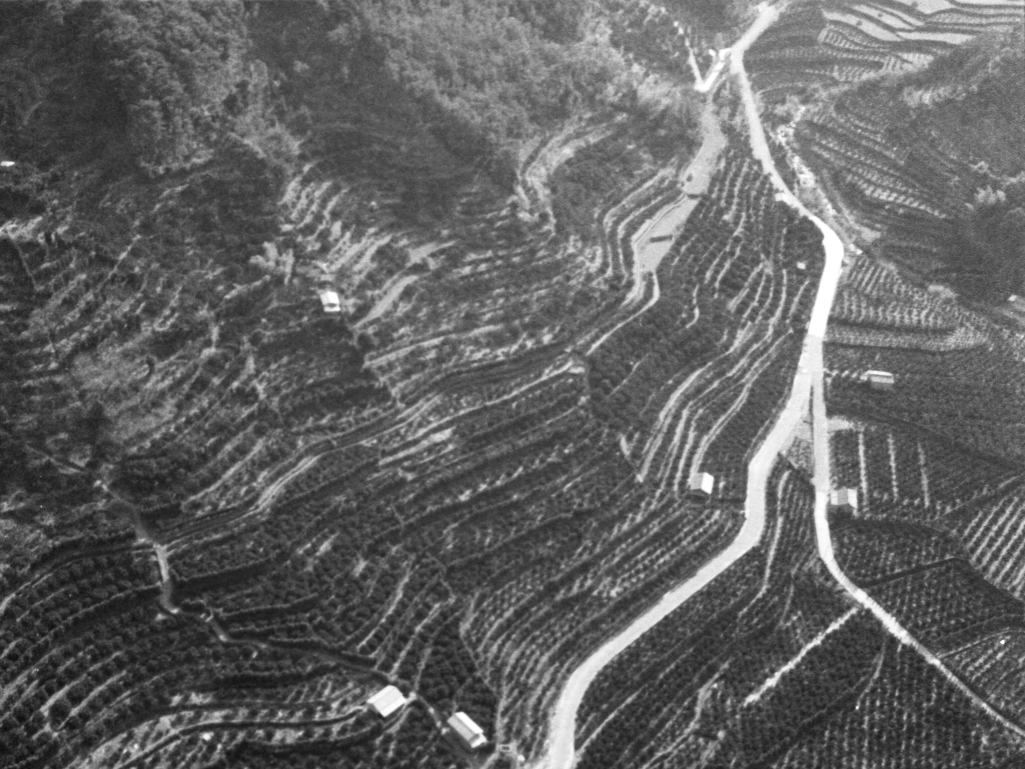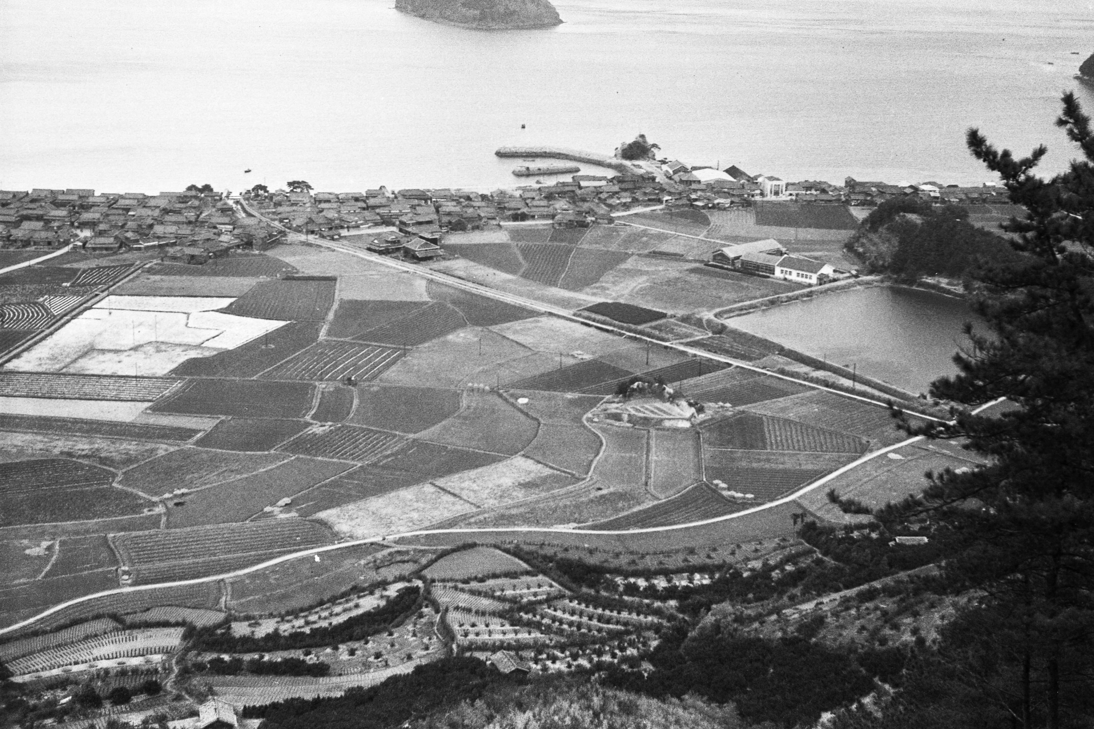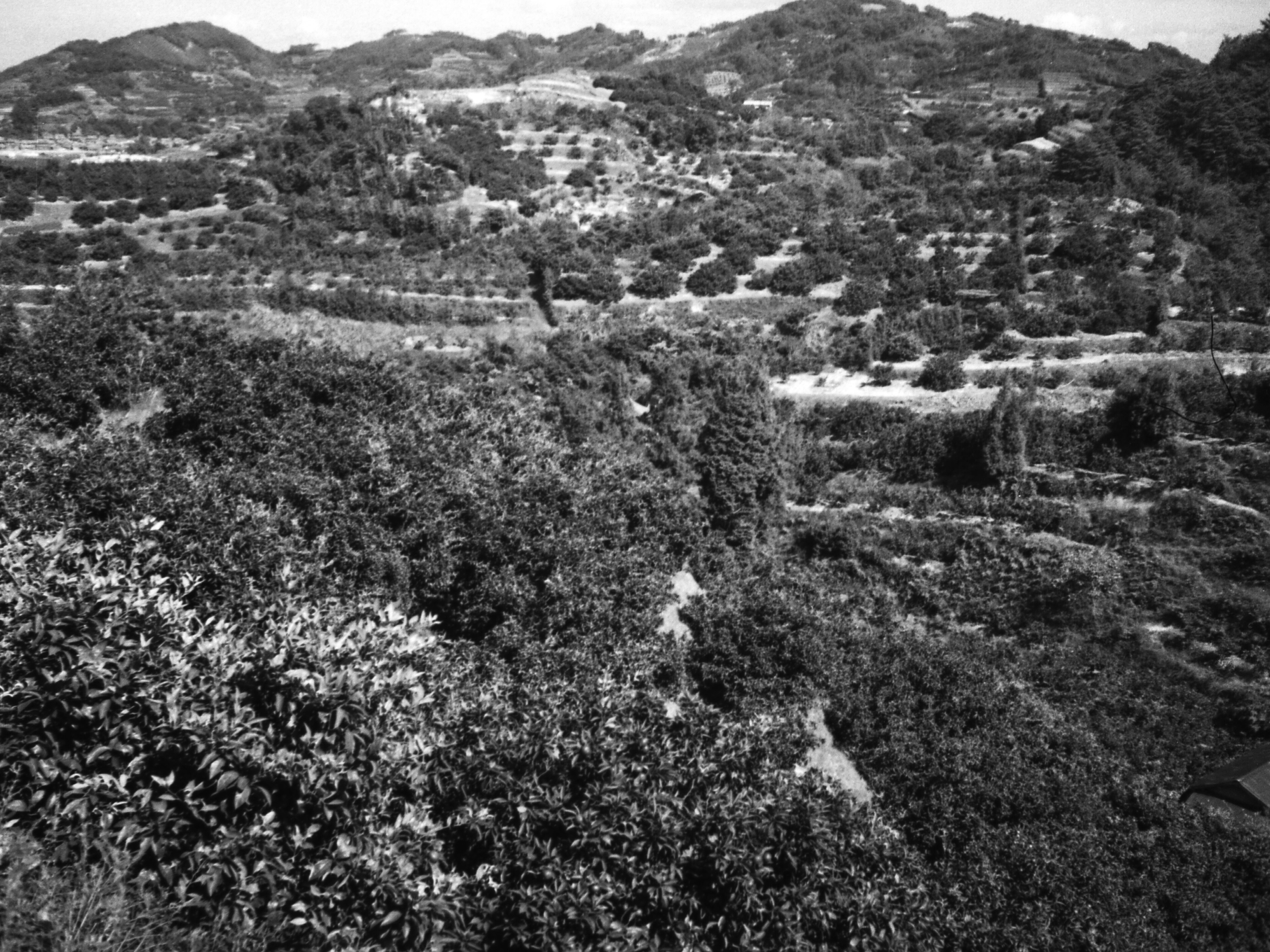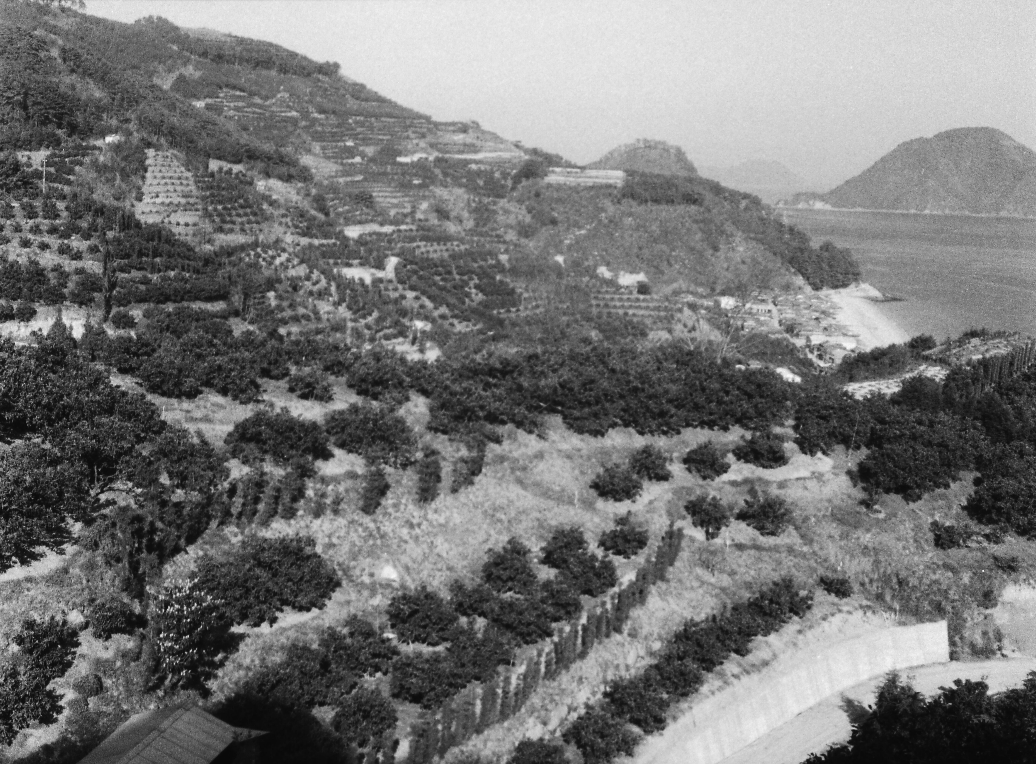ミカンの植栽が急速に進められた結果、ミカン園は、東和町で857町(1972年)、橘町で705町(1973年)、大島町で471町(1972年)、久賀町で417町(1972年)まで拡大する。収穫量のピークは1972年で、東和町は24,600t、橘町は24,100t、久賀町は15,800t、大島町は14,700tをあげている(福原1998:30)。宮本は1966年12月に島の上空をヘリコプターで飛んだ際、久賀の耕地の様子を写真に撮っている(写真8)。『私の日本地図9』では、「久賀の町の東南部の谷の田はミカンでおおわれていた。棚田そのままでも、畔が曲線を描いているのが特に不思議な美観を生み出しているが、ミカンが植えられると、また違った美しさが生れてくる」と書いている(宮本1971:109)。宮本は同書で「人間が作り出した風景の中でミカン畑だけは美しい。それは瀬戸内海の島の新しい風景になろうとしている」とも述べている(同前:68)。